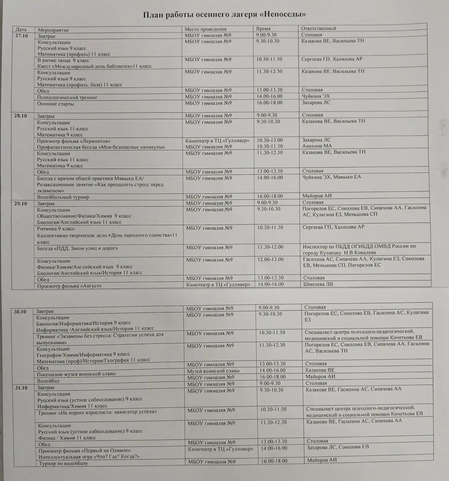 План работы осеннего лагеря " НЕПОСЕДЫ"