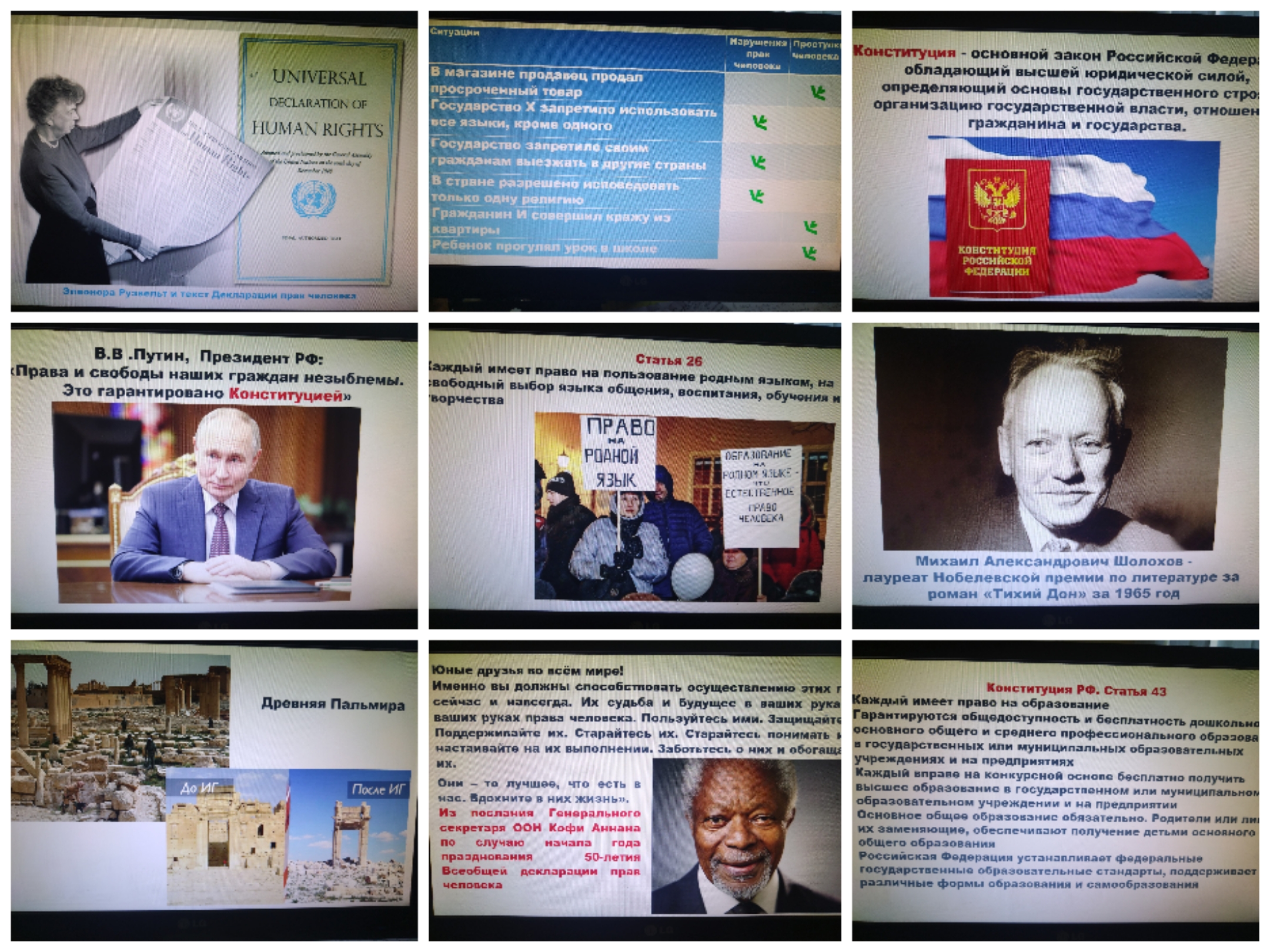 Социальный педагог Анохина М.А. провела интерактивный урок, рассказывая ученикам обо всех аспектах Всеобщей декларации прав человека и знакомила ребят с историей ее разработки .
