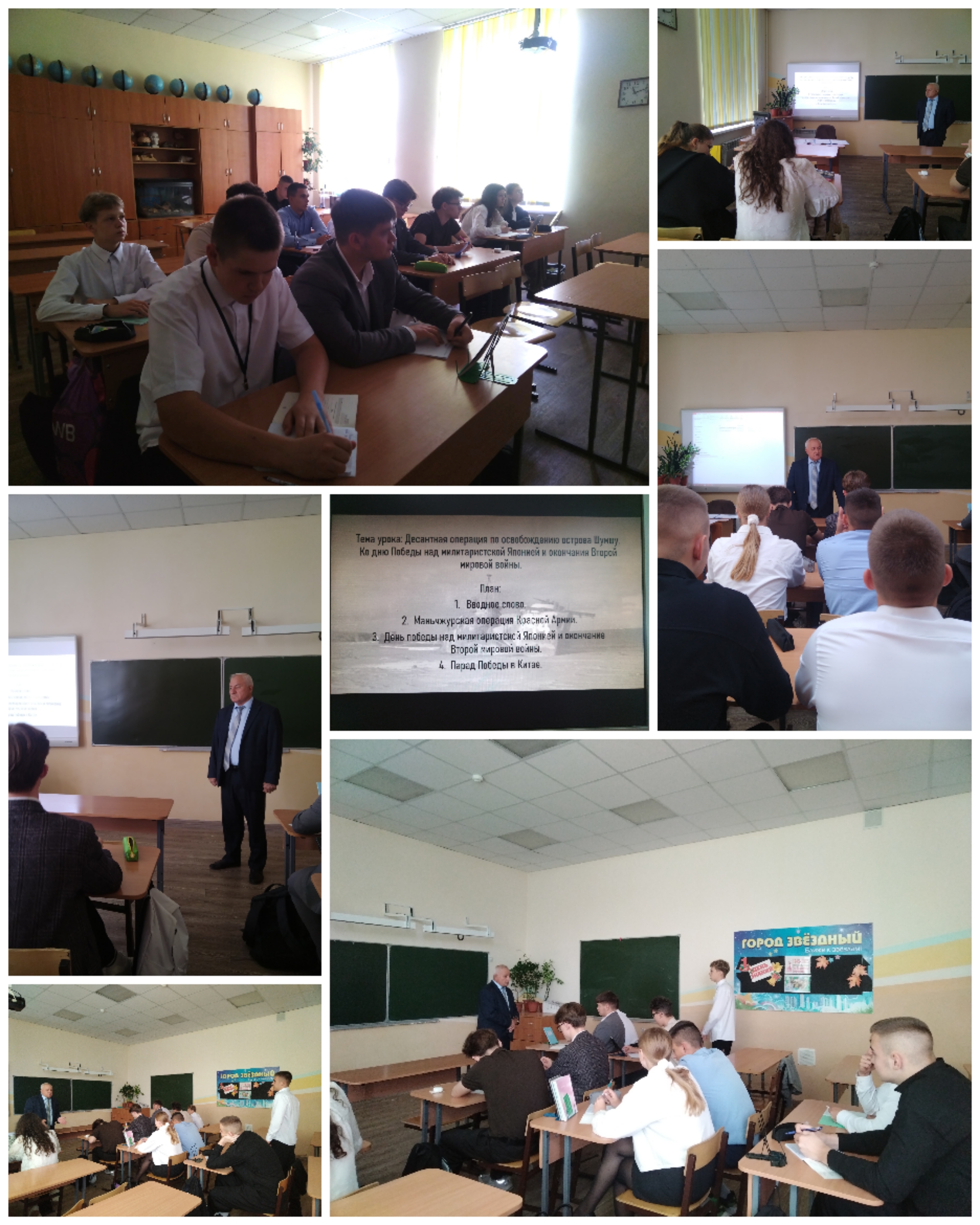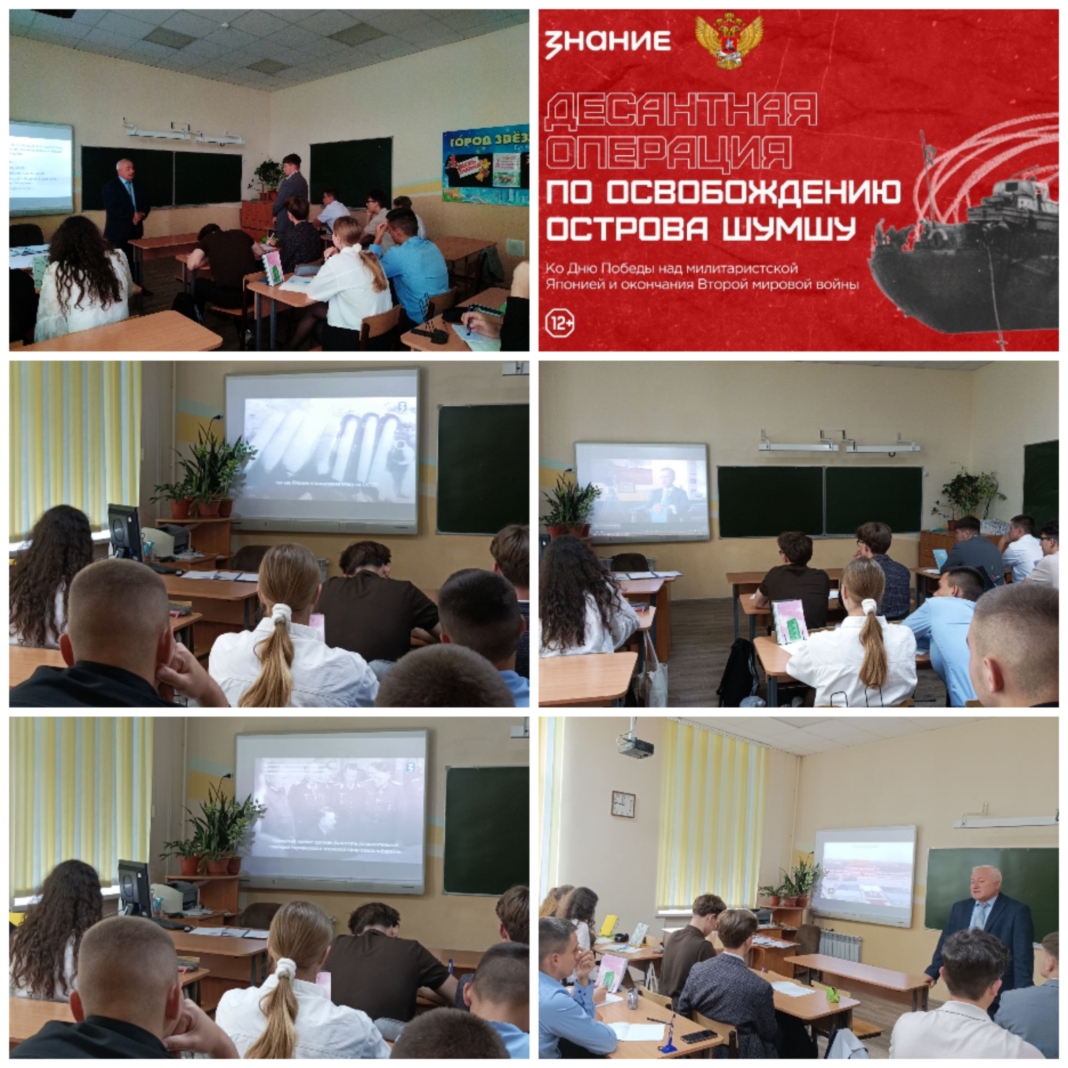 Учитель ОБЗР, Майоров Александр Иванович, подготовил программу урока, используя рекомендации Российского общества "Знание". Ребята погрузились в историю героического освобождения острова Шумшу, изучив ключевые факты о десантной операции. Особое внимание было уделено презентации, посвященной этому событию, а также видеоролику с участием Владимира Мединского, помощника президента Российской Федерации.